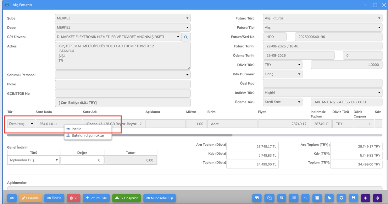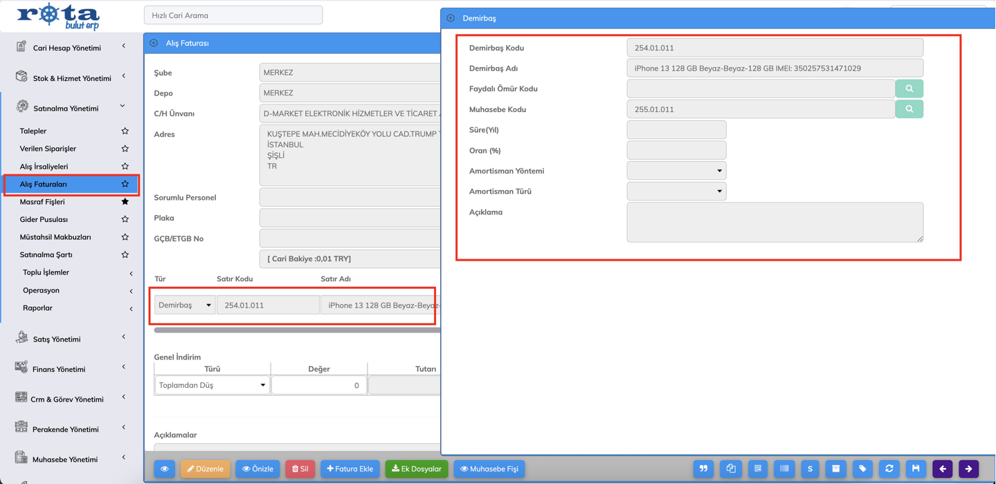 Alış Faturalarında Demirbaş Kartına Hızlı Erişim Özelliği Eklendi