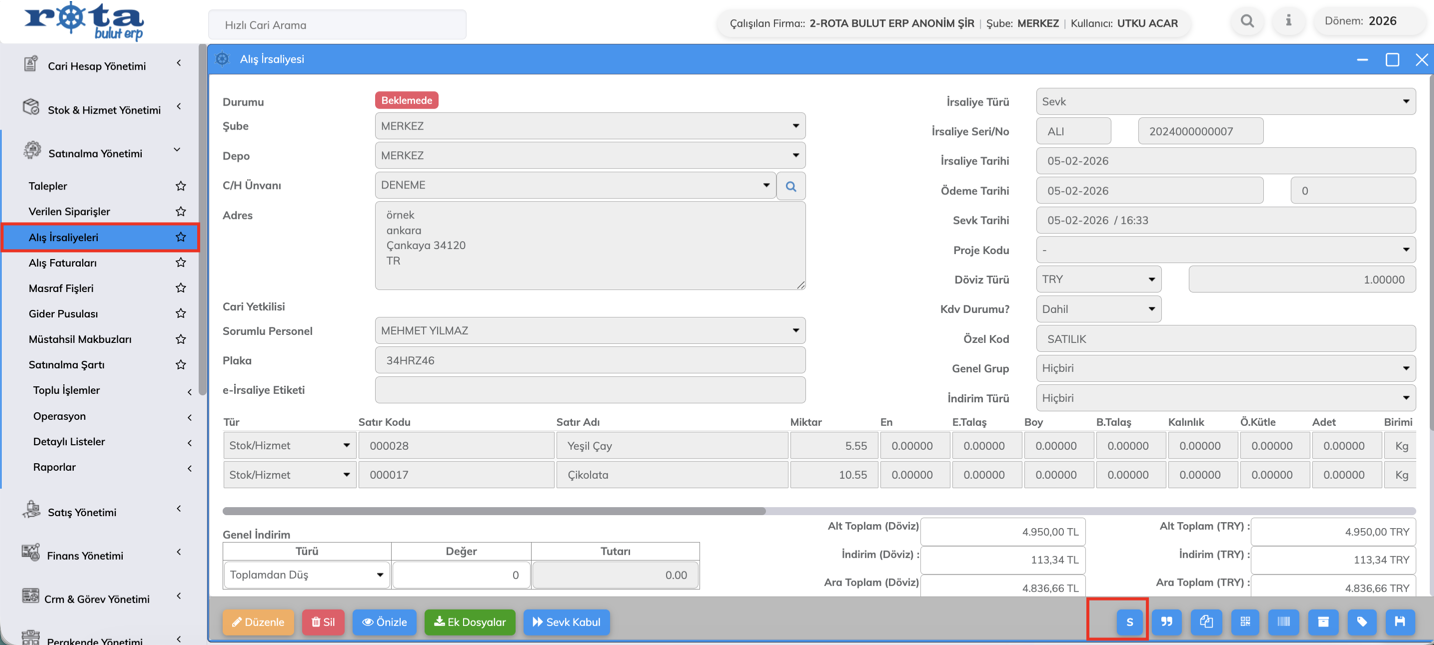 Alış irsaliyesi alt barına yeni bir “S” butonu eklenmiştir.