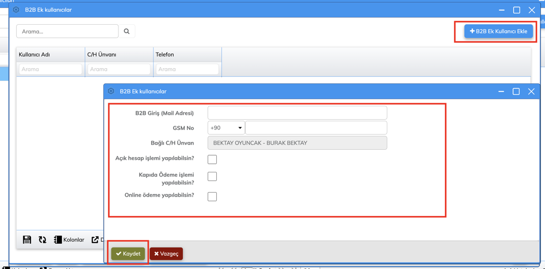 B2B modülünde, bir cariye tanımlanan B2B hesabına birden fazla kullanıcı eklenebilmesi özelliği geliştirilmiştir.
