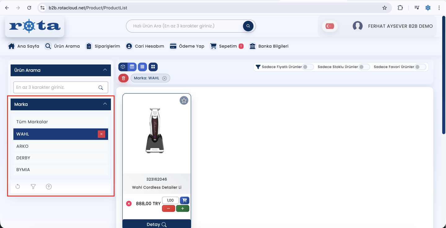 Bu güncelleme ile birlikte, B2B stok listelerinde yer alan arama alanı; “markaları göster”, “ürün grubu göster” gibi seçenekler ile zenginleştirilmiştir. Kullanıcılar, belirledikleri kriterlere göre stokları filtreleyerek daha doğru ve hızlı arama yapabilir.