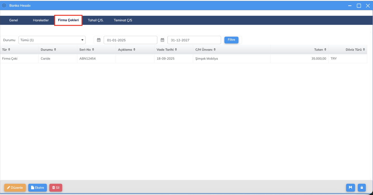 Düzenlenmiş firma çeklerinin listelenebileceği,