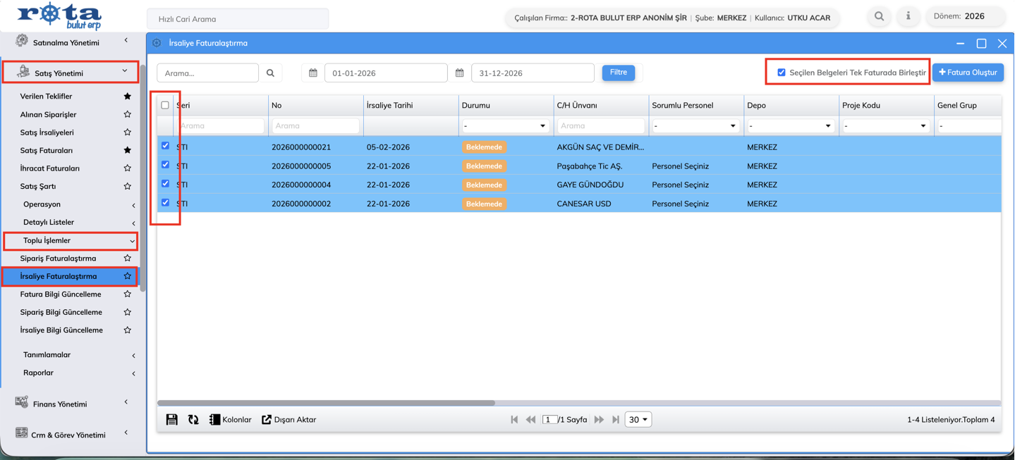 Kullanıcı, faturalaştırmak istediği irsaliyeleri seçerek işlem yapabilir.
