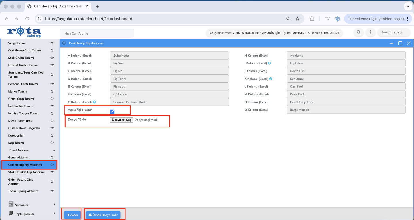 İşletmelerin farklı yazılımlarda oluşan finansal verilerini tek bir merkezde yönetebilmesini kolaylaştırmak amacıyla, cari hareket fişlerinin başka yazılımlardan Excel dosyası ile Rota’ya aktarılmasına yönelik yeni bir geliştirme hayata geçirildi.