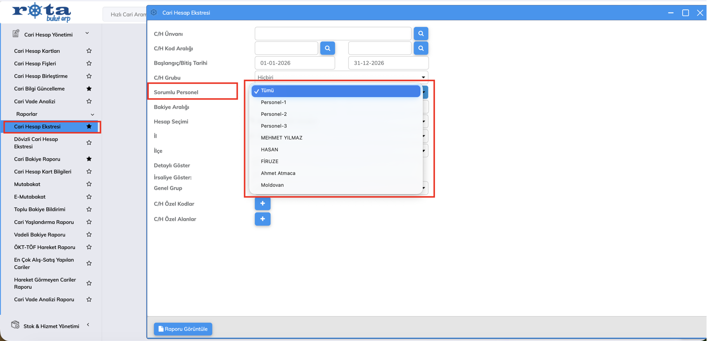 Cari Hesap Ekstresi Raporuna Sorumlu Personel Filtreleme Alanı Eklendi