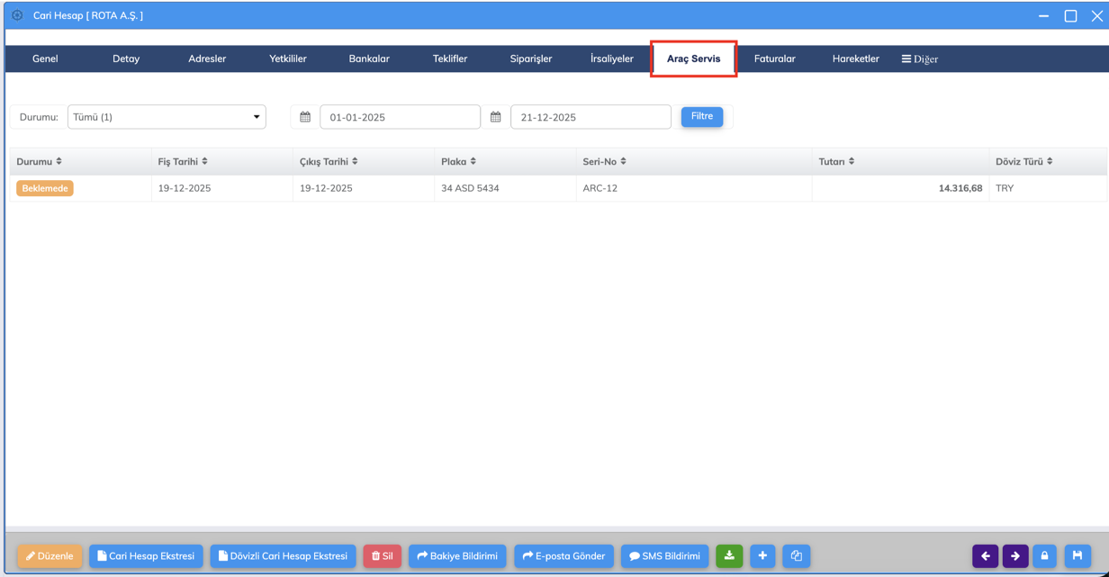Bu sayede kullanıcılar, cari ile ilişkili araç servis işlemlerine tek ekrandan ulaşarak operasyonel süreçlerini daha hızlı ve verimli şekilde yönetebilmektedir.