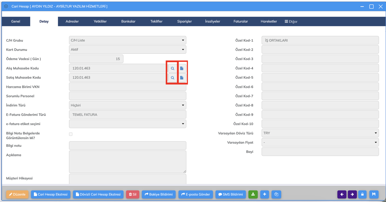Bu geliştirme kapsamında, cari hesap kartında tanımlı: