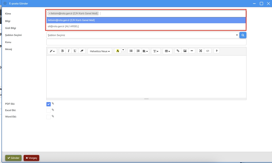 Bu geliştirme sayesinde kullanıcılar, mail gönderim işlemlerinde alıcı adreslerini manuel olarak eklemek zorunda kalmadan, cari kartta tanımlı iletişim bilgilerini doğrudan kullanabiliyor.
