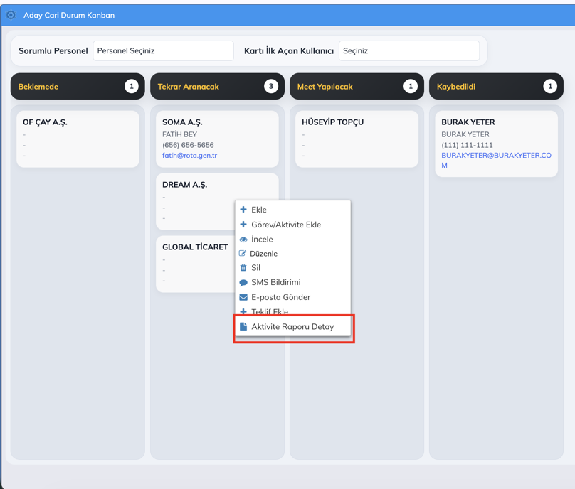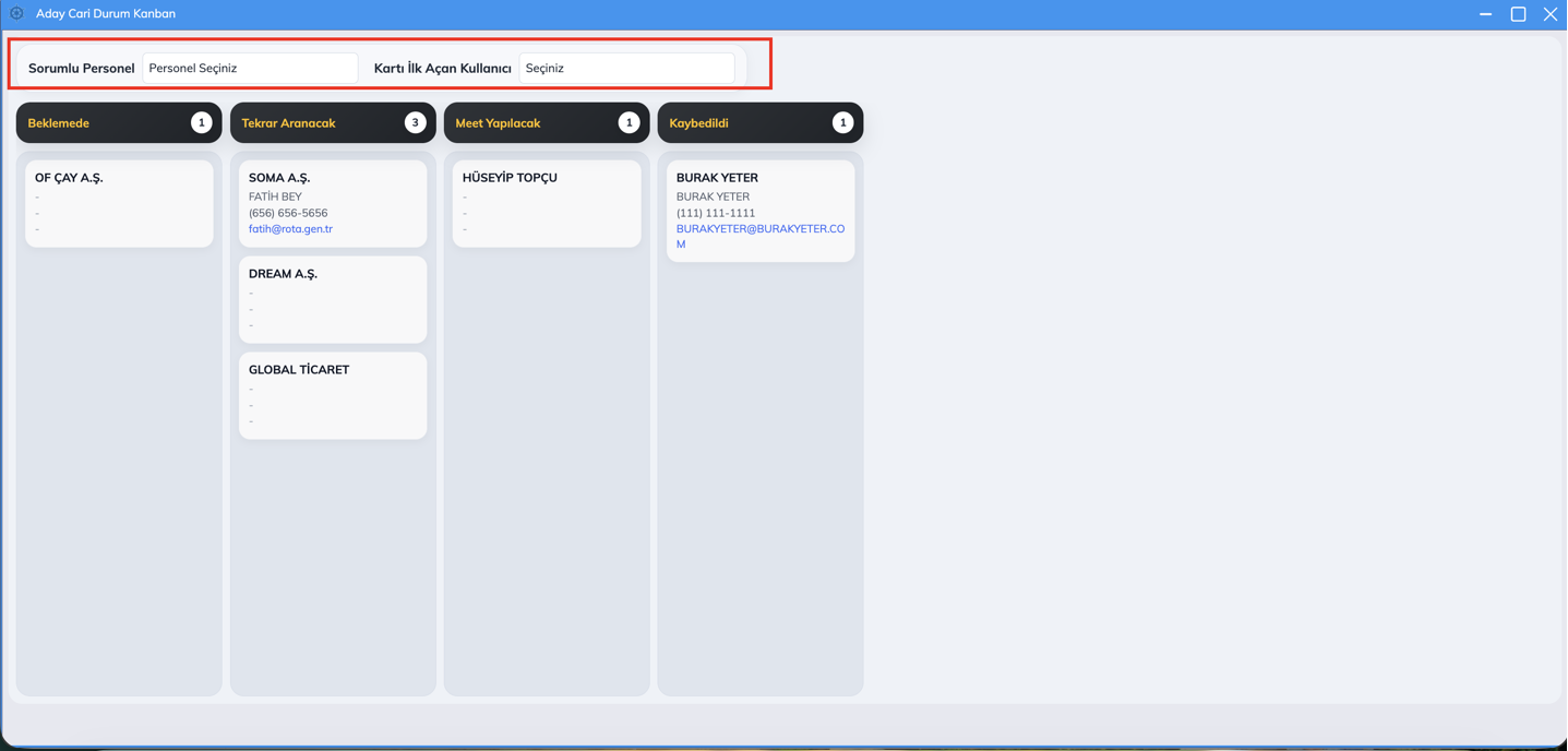 Ayrıca, Kanban ekranlarına aday cariyi açan kullanıcı ve son sorumlu personel bazında filtreleme alanları eklenmiştir. Bu sayede kullanıcılar, kayıtları daha hızlı ve hedefli bir şekilde listeleyebilir.