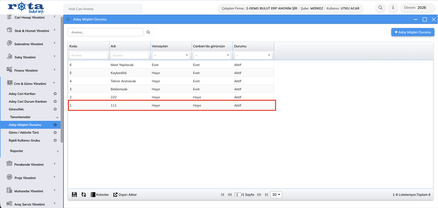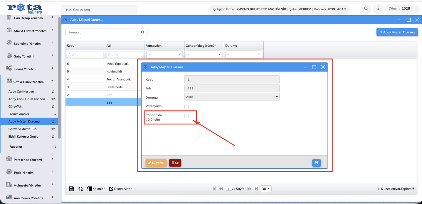Bu güncelleme ile birlikte, aday müşteri durumlarının pasife alınabilmesi ve bu kayıtların Kanban ekranlarında görüntülenebilmesi sağlanmıştır.