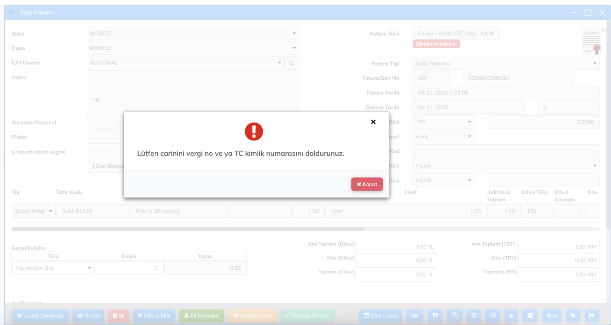 Fatura gönderimi yapılırken, caride TC kimlik numarası veya vergi kimlik numarası zorunluluğu aktif değilse ve cari hesap kartında bu bilgiler kayıtlı değilse, sistem artık kullanıcıyı bilgilendiren bir e-Fatura gönderimi hata bildirim ekranı göstermektedir.