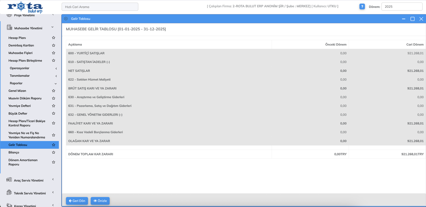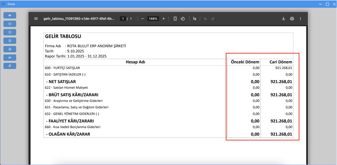 Gelir Tablosu ekranına iki yeni alan eklendi: Önceki Dönem ve Mevcut Dönem.