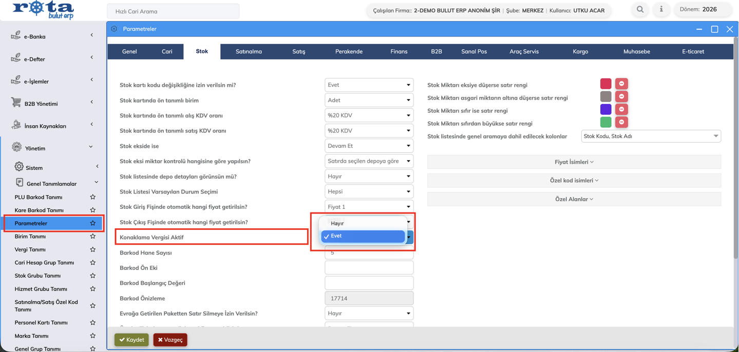 Bu kapsamda, ilgili ayarlar sırasıyla Parametreler menüsü altında yer alan Stok Parametreleri bölümünden yapılmaktadır.