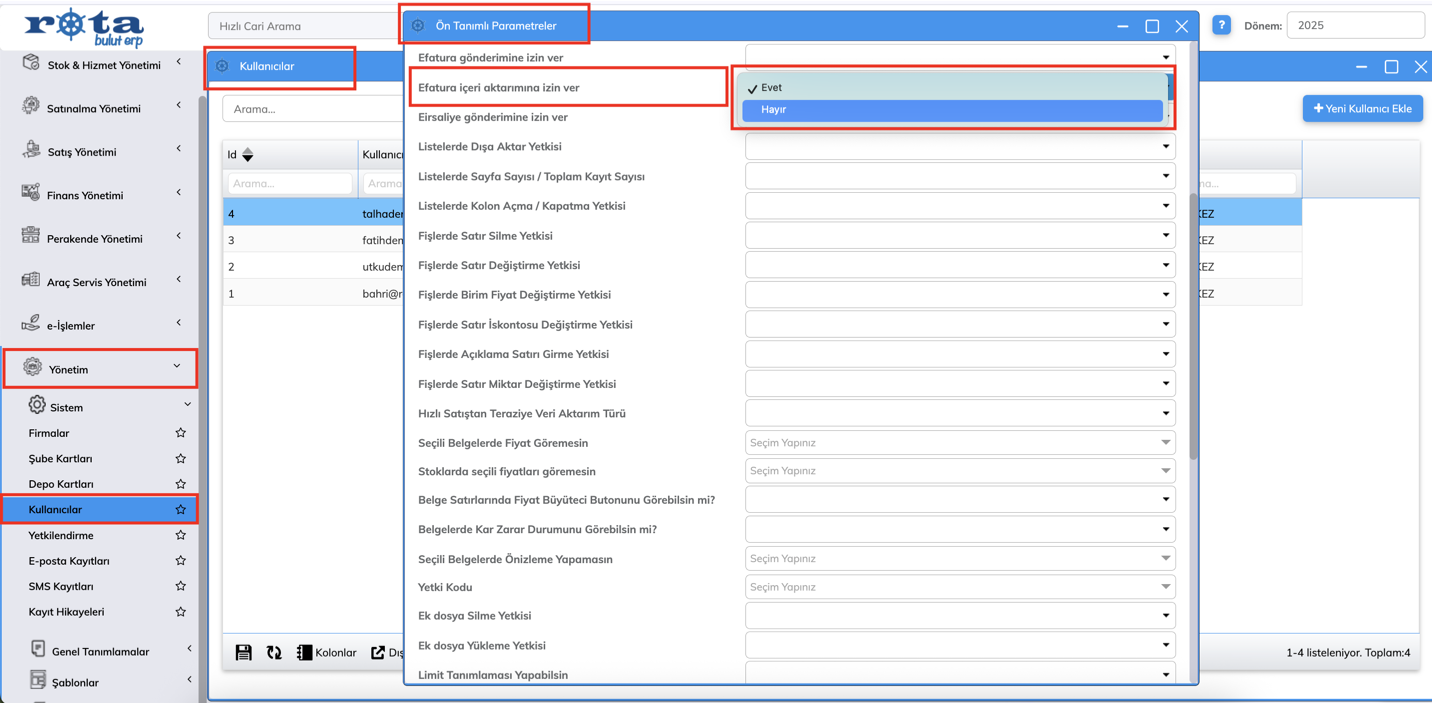 Kullanıcı Parametrelerine e-Fatura İçe Aktarma Yetkisi Alanı Eklendi