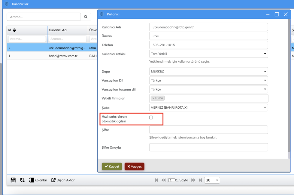 Bu alan sayesinde, kullanıcı sisteme giriş yaptığında Hızlı Satış ekranının otomatik olarak açılması sağlanabiliyor. ( kullanıcı hızlı satış kullanıyor ise )