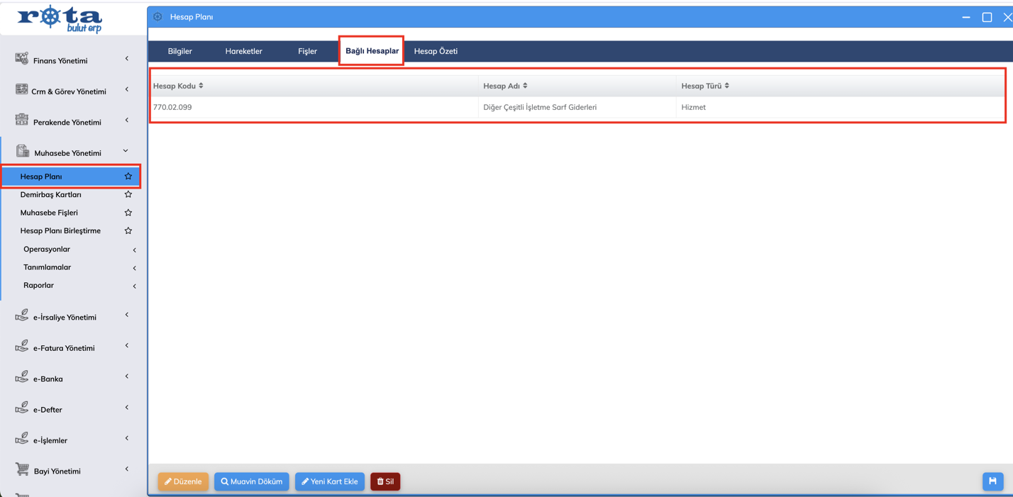 Hesap Planı Kartı üzerinde Bağlı Hesaplar alanı - Rota Bulut ERP