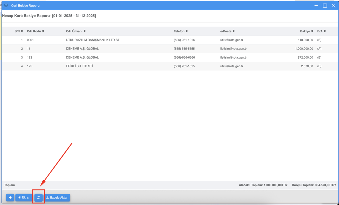 Tüm rapor ekranlarının alt kısmına, verilerin güncel halini hızlıca görüntülemek için Yenileme (Refresh) butonu eklendi.