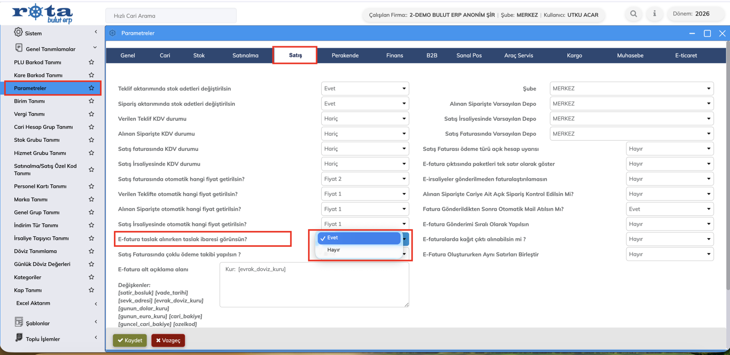 Bu güncelleme ile birlikte, Rota üzerinden alınan taslak fatura çıktısına yönelik parametre kullanıma sunulmuştur. Kullanıcılar, bu parametre sayesinde taslak fatura çıktılarının yönetimini ihtiyaçlarına göre yapılandırabilir. Parametre Aktif edilirse taslak fatura üzerinden “Taslaktır” ibaresi yer alacaktır.
