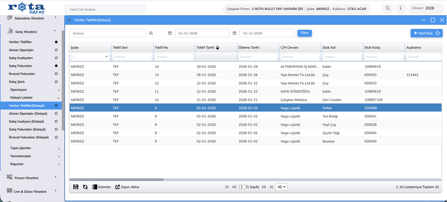 Satın alma, Satış, Araç Servis Yönetimi ve Perakende Yönetimi modüllerinde bulunan: