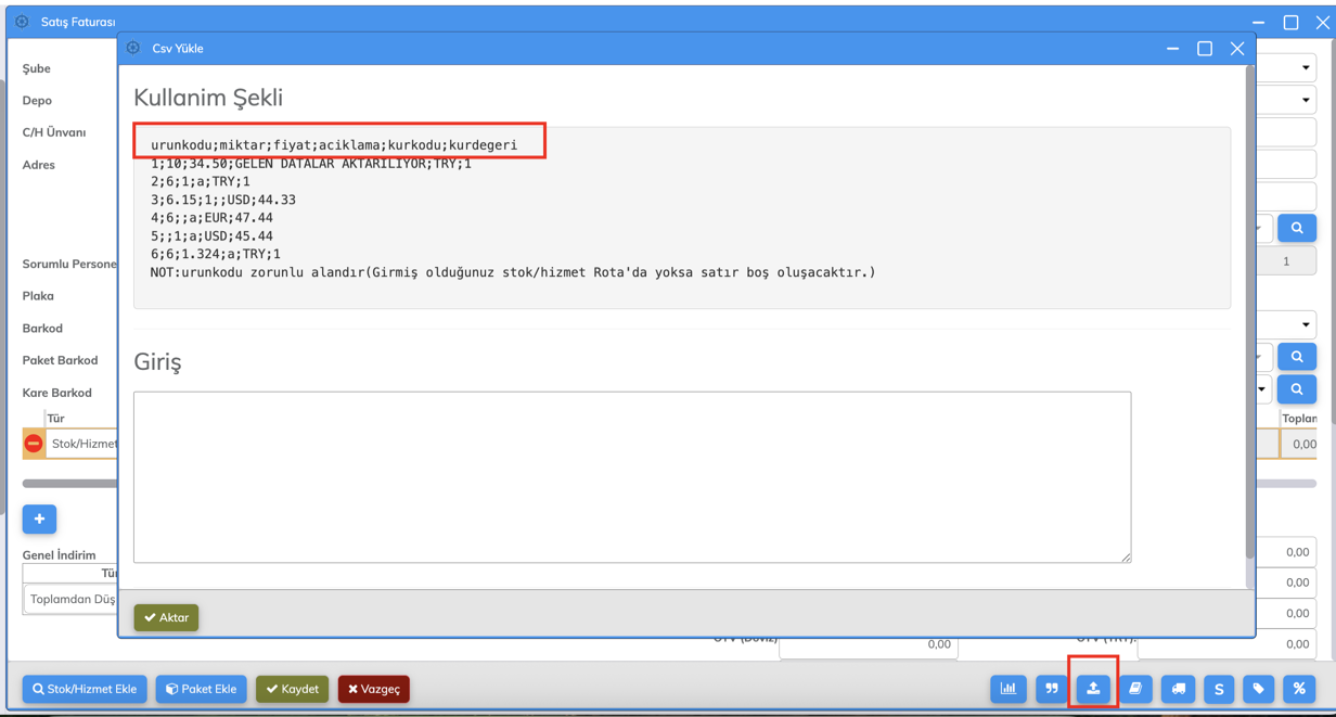 Satış, Satınalma, İhracat ve Stok Belgeleri ekranlarında bulunan Excel ve CSV aktarım alanları revize edildi.