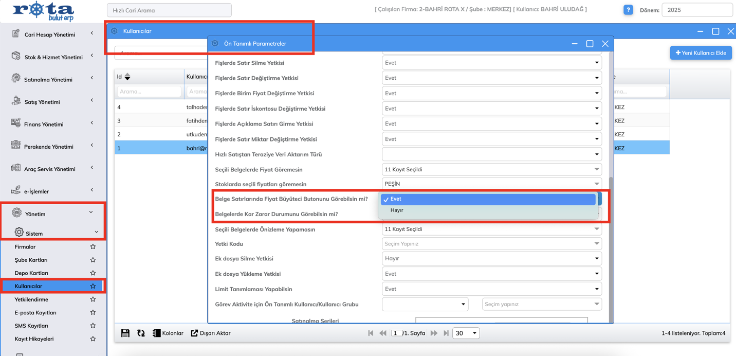 Artık satış ve satınalma belgelerinde yer alan fiyat büyüteci, kullanıcı ön tanımlı parametreleri üzerinden yönetilebiliyor. Bu sayede firmalar, stok veya hizmet kartlarında bulunan fiyat bilgilerinin belirli kullanıcılar tarafından görülmesini veya gizlenmesini kolayca kontrol edebiliyor.