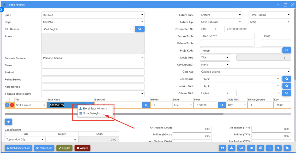 Rota Bulut ERP’de tüm satış ve satınalma belgelerinin satırlarında sağ tuş