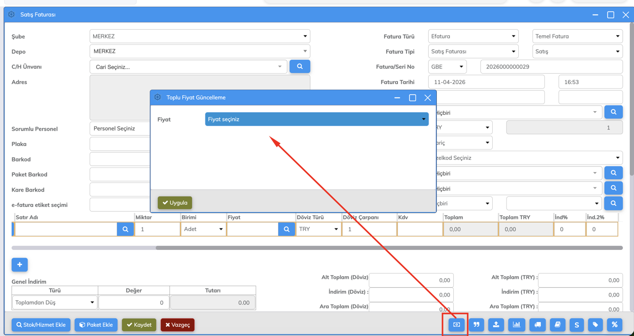 Bu güncelleme ile birlikte, tüm satış ve satınalma belgelerinde yer alan satırlara, sistemde tanımlı fiyatların toplu olarak seçilip uygulanabilmesi sağlanmıştır.