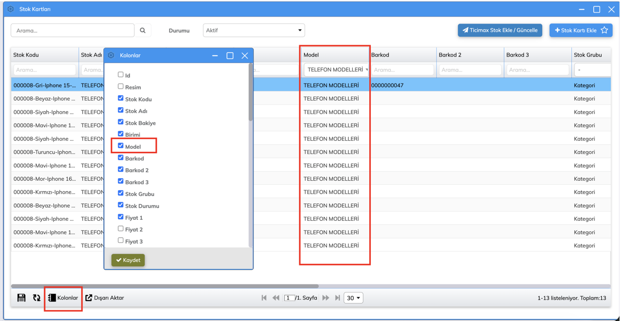 Varyant lisansına sahip şirketler için stok listesi kolonlarına “model” seçim alanı eklendi.