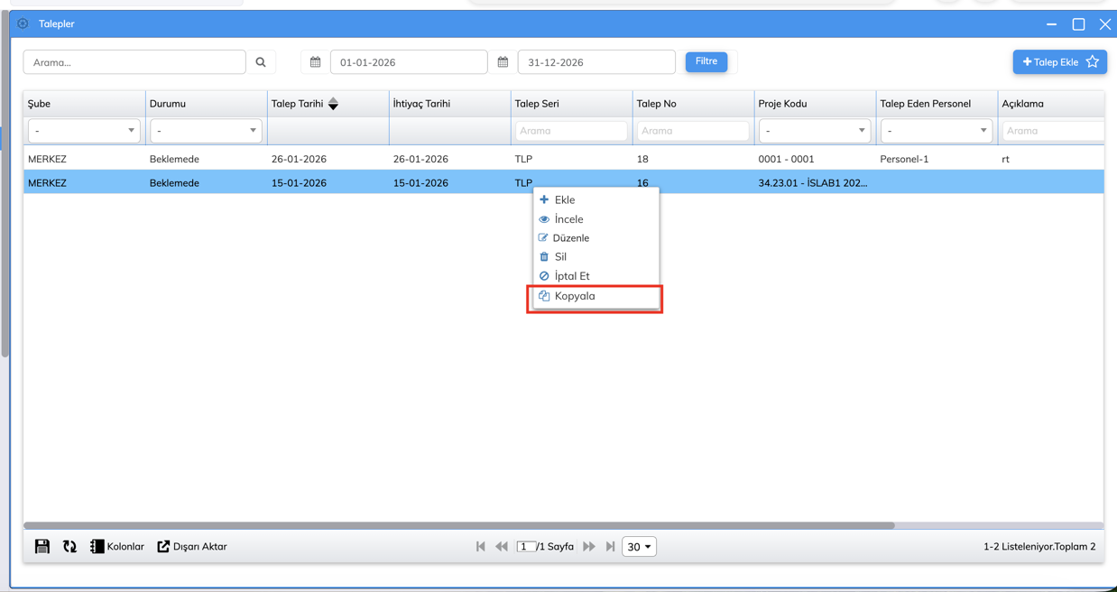 Ayrıca, inceleme ekranı ve liste ekranlarında sağ tık menüsü üzerinden talep fişini kopyalama işlemi gerçekleştirilebilir hale getirilmiştir.