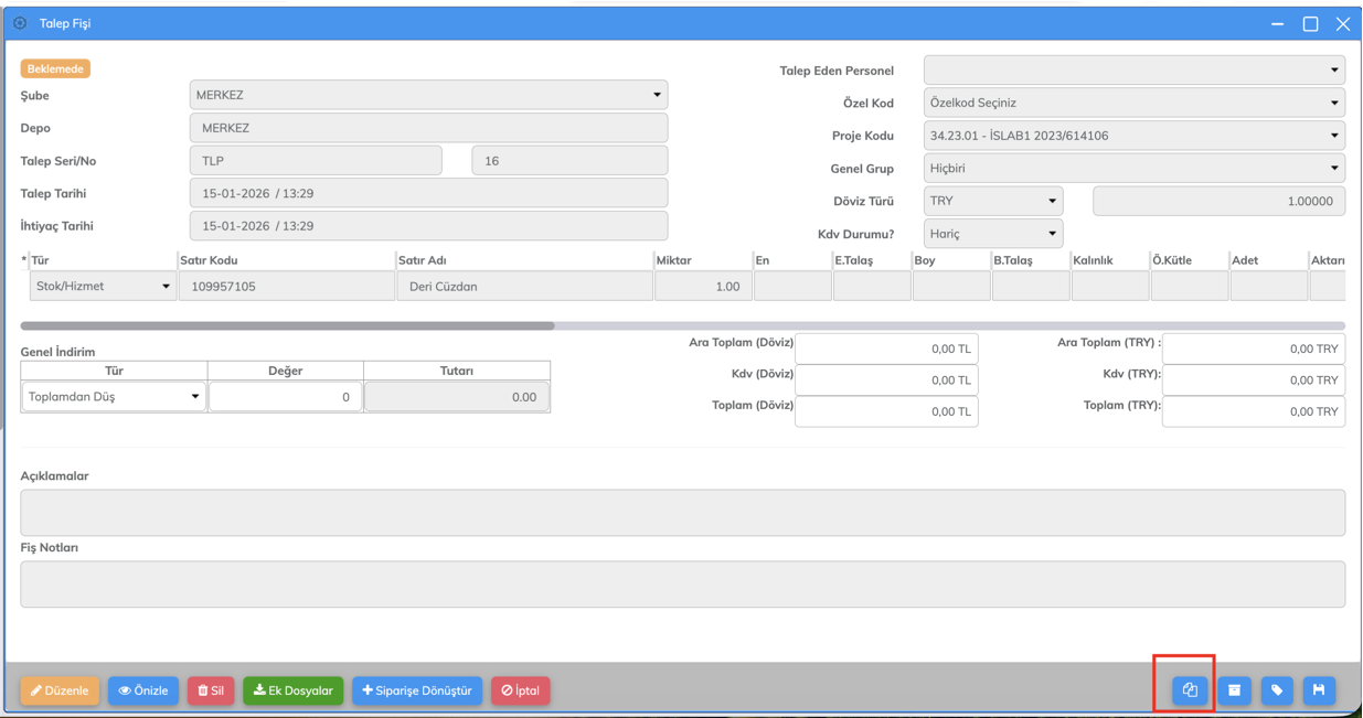 Talep Fişlerine Kopyalama Özelliği Eklendi