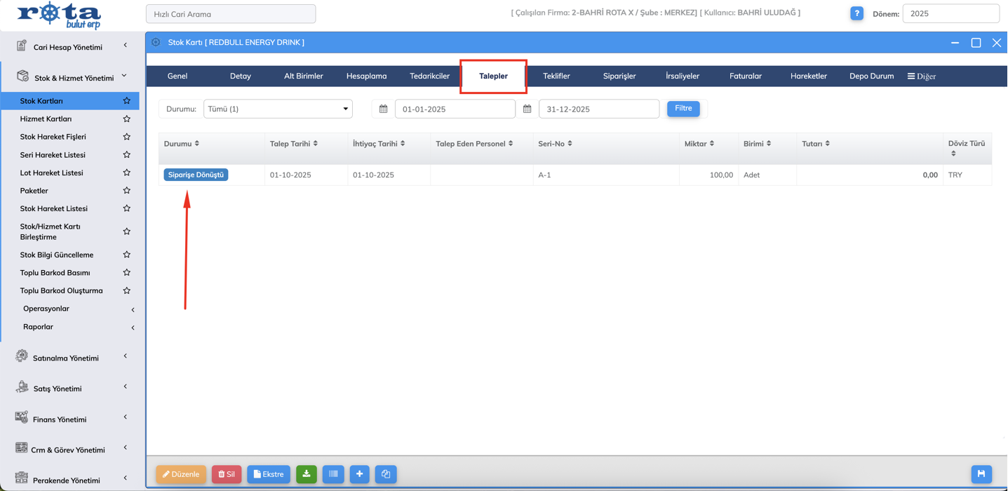 Bu sekme sayesinde, seçilen stoğa ait tüm talep kayıtları artık doğrudan ilgili stok üzerinden görüntülenebiliyor.
