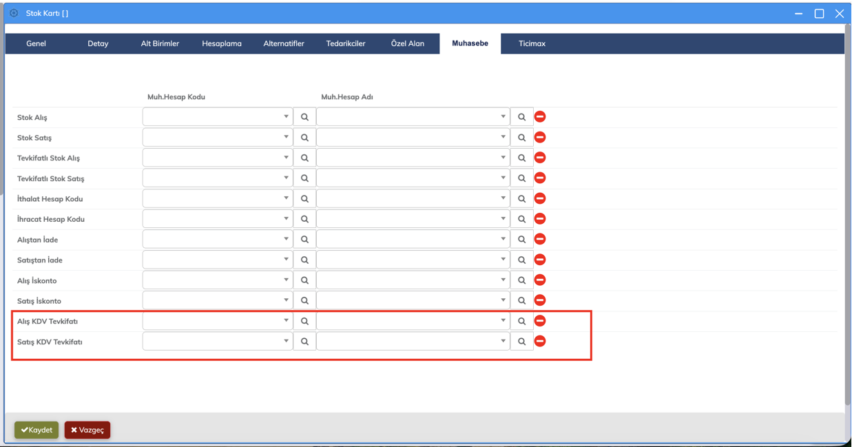 Ayrıca, Stok ve Hizmet Kartları içerisinde yer alan muhasebe sekmesine aşağıdaki yeni alanlar eklenmiştir: