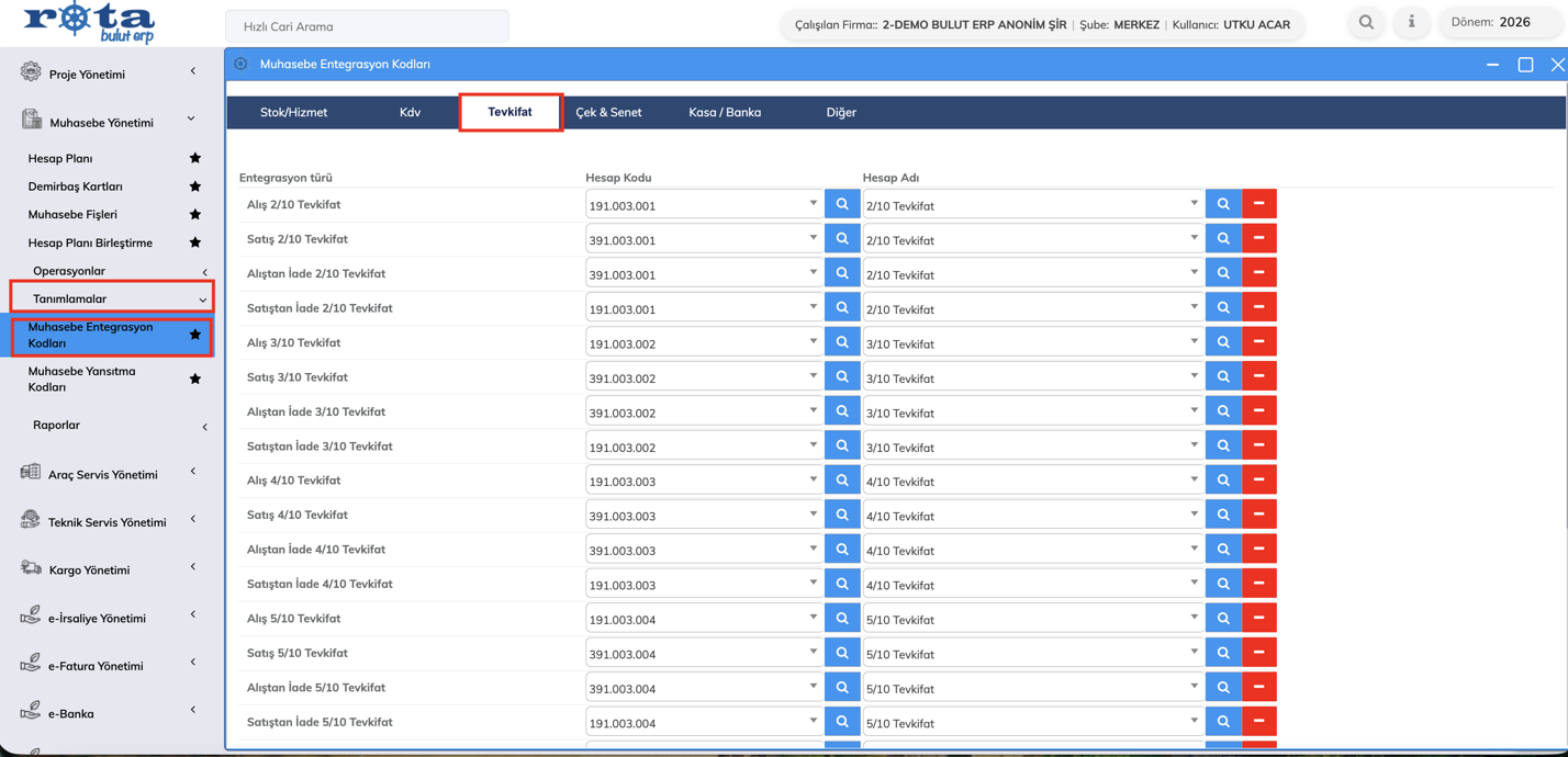 Bununla birlikte, Muhasebe Yönetimi > Tanımlamalar > Muhasebe Entegrasyon Kodları bölümüne tevkifat muhasebe kodlarının tanımlanabileceği yeni bir alan eklenmiştir.