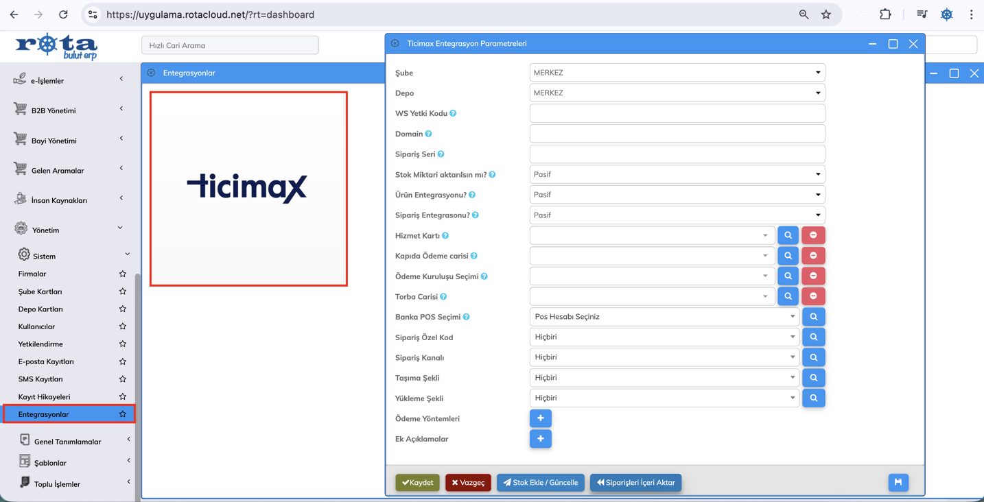 Ticimax mağazanızdaki siparişler anında Rota Bulut ERP’ye aktarılıyor; böylece sipariş girişlerini manuel yapmanıza gerek kalmıyor.