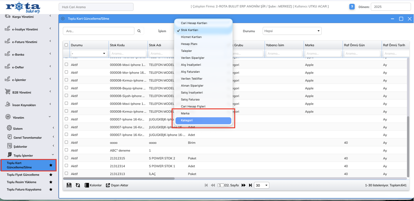 Toplu “Marka” ve “Kategori” Kartlarını Silme Özelliği Eklendi