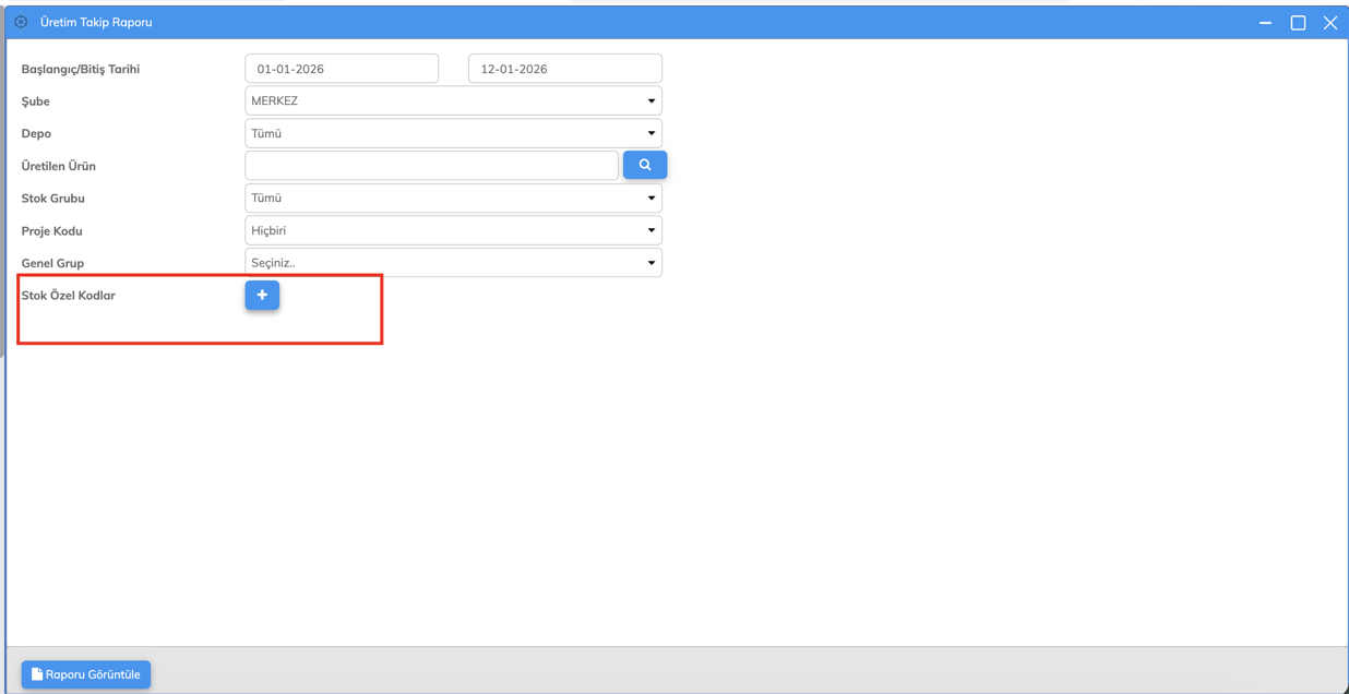 Üretim Takip Raporuna Stok Özel Kod Filtresi Alanı Eklendi