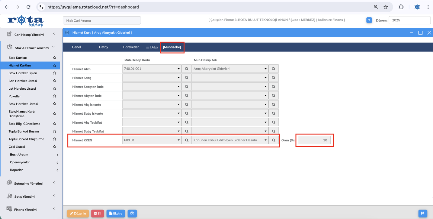 Stok & Hizmet Yönetimi > Hizmet Kartları > Hizmet Kartı > Düzenle (veya Yeni Kart) menüsüne girilir.